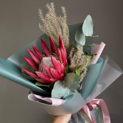Букет из 11 персиковых мини-гербер и зелени в дизайнерской упаковке “Персиковые бабочки”