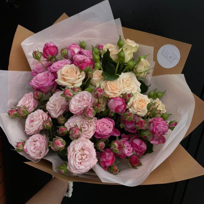Альстромерии, Гвоздики, Кустовые розы, Лизиантусы, Розы, Хризантемы