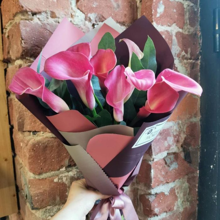 Букет из 9 розовых калл с эвкалиптом