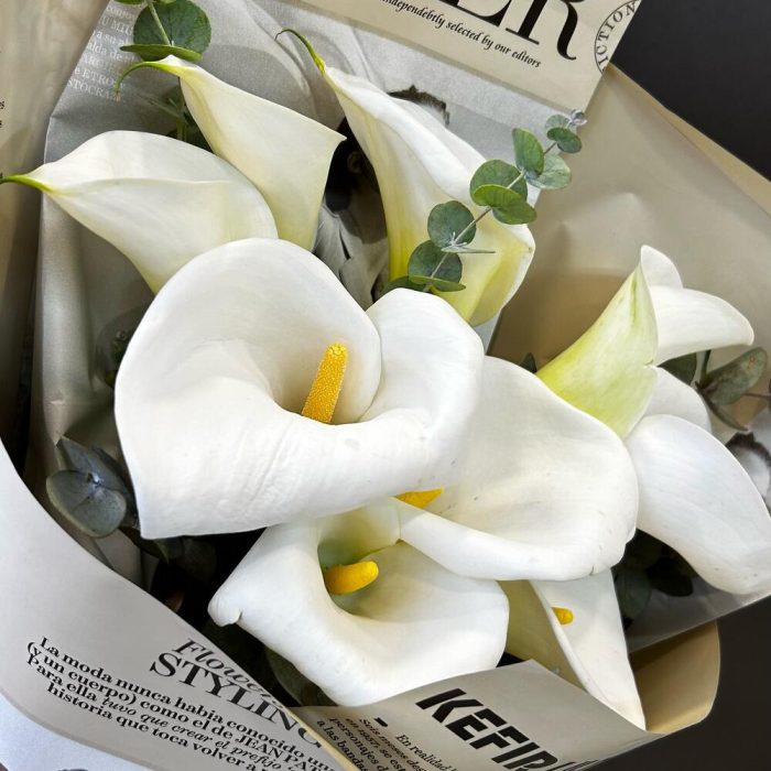 Букет из белой каллы и ароматного эвкалипта в упаковке
