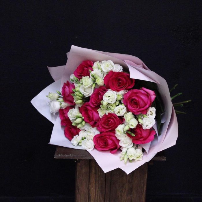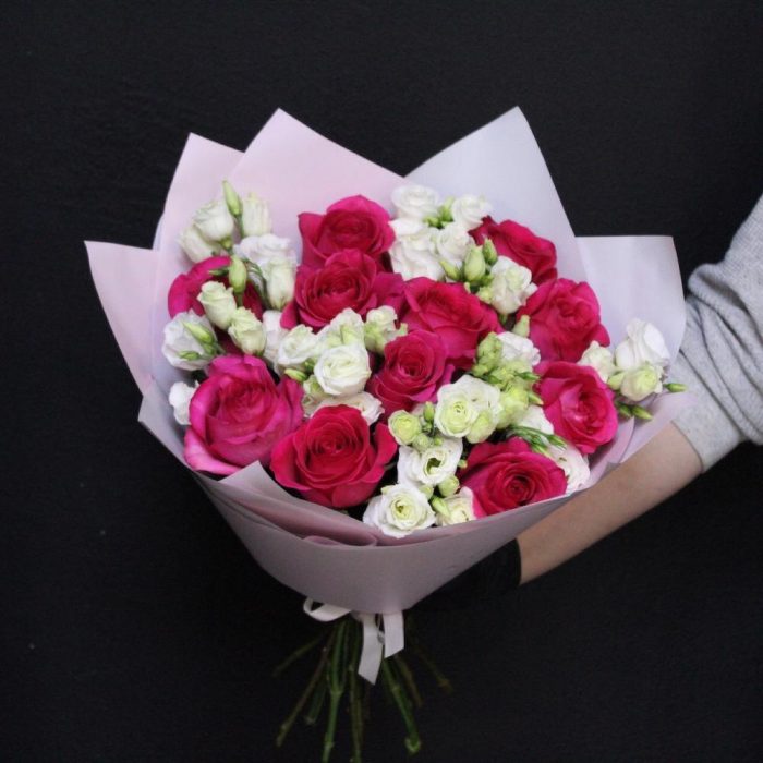 Роза Pink Floyd – 11 шт.Эустома – 8 шт.Пленка дизайнерская – 3 шт.Лента атласная – 1 шт.