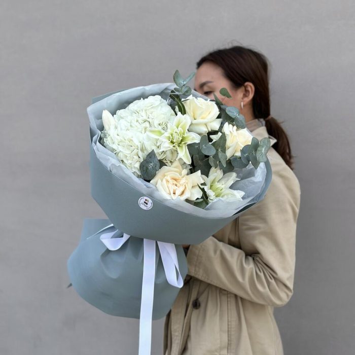 Гортензия – 1 шт. Лилия – 2 шт. Роза – 3 шт. Эвкалипт – 2 шт.