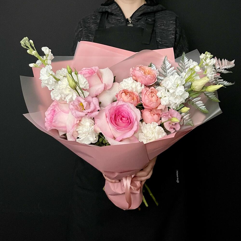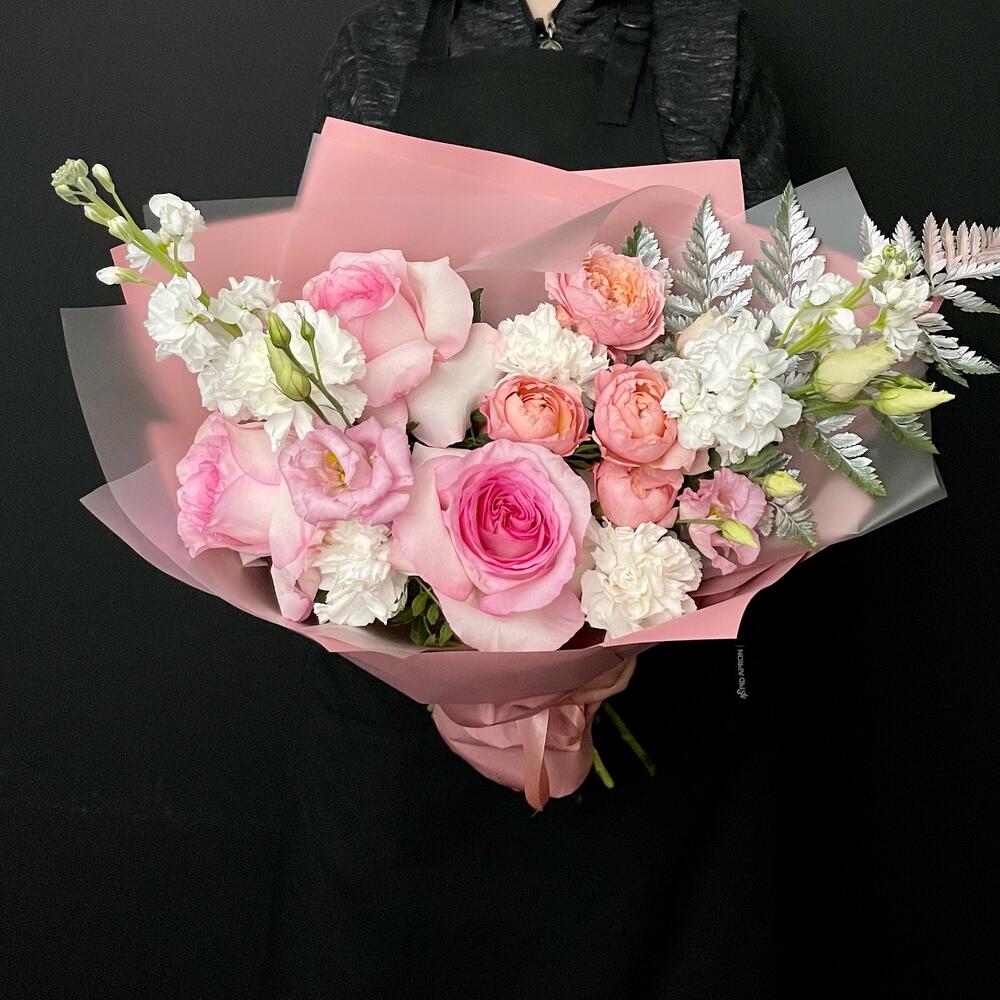Маттиола – 2 шт.Папоротник – 1 шт.Эустома – 1 шт.Диантус – 4 шт.Пионовидная роза – 3 шт.Пионовидная кустовая роза – 1 шт.Дизайнерская упаковка – 3 шт.