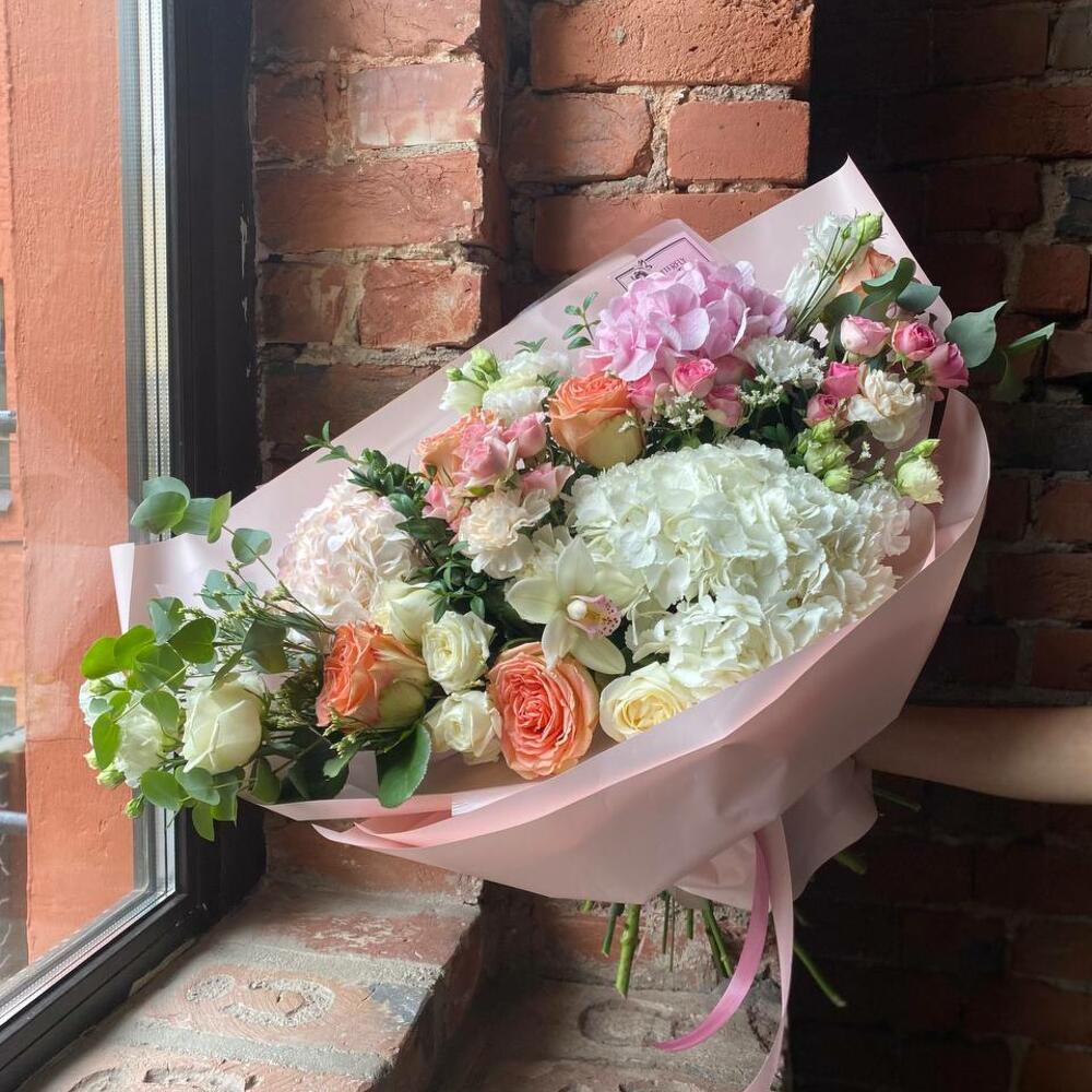 Букет из гортензий, пионов и пионовидных роз «Струны души»