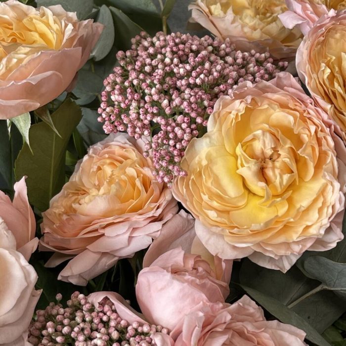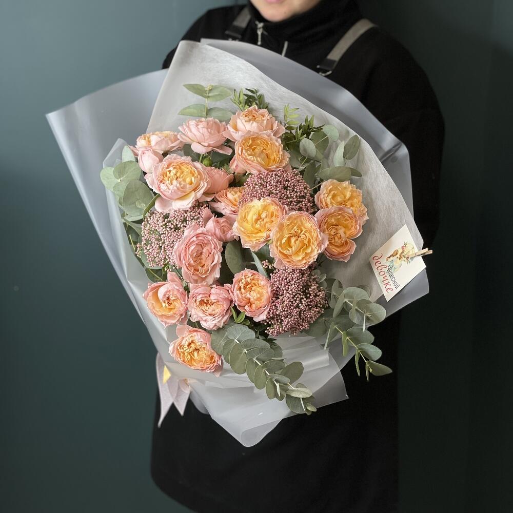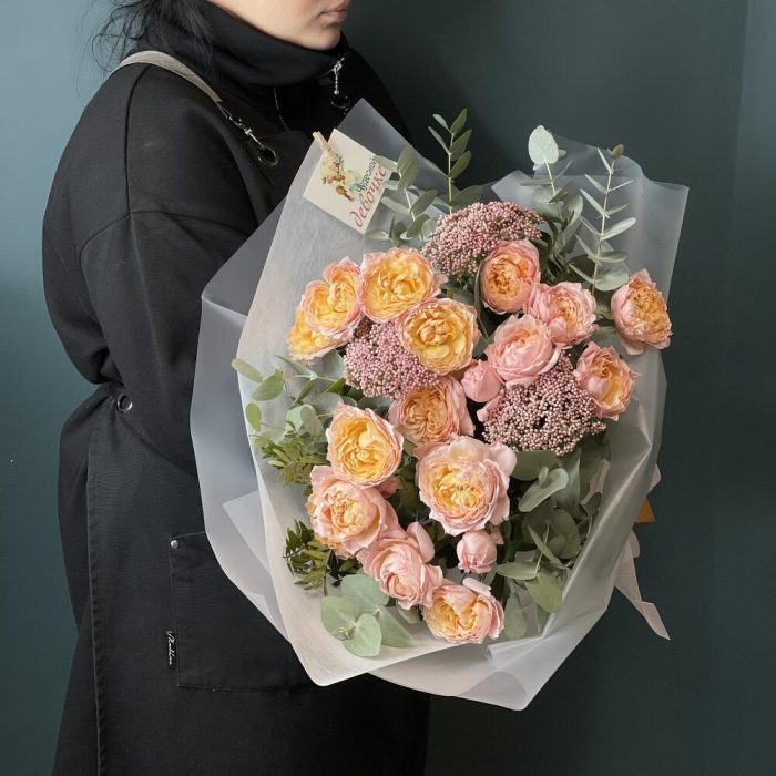 Букет из пионовидной кустовой розы и эвкалипт