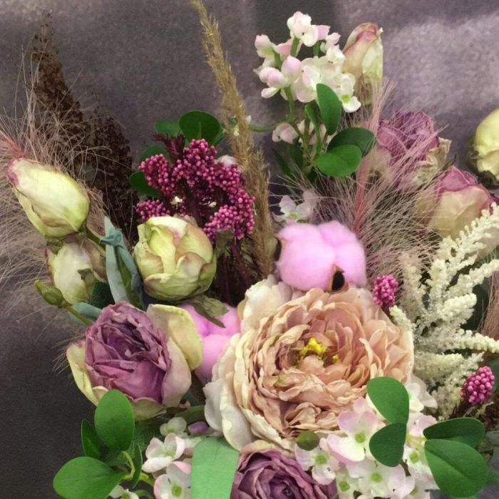Пионовидная роза – 3 шт.Сухоцветы – 6 шт.хлопок искусственный окрашенный – 2 шт.