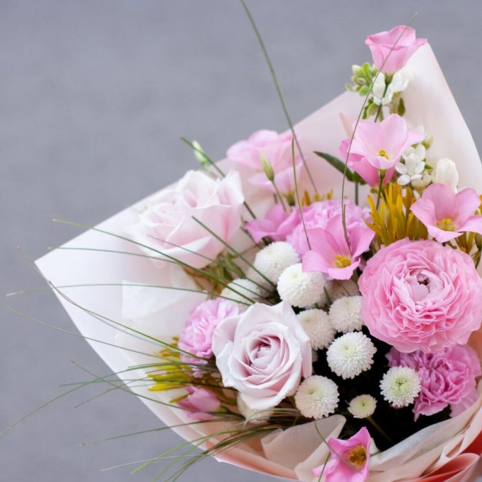 лизиантус ботаника – 1 шт.Ранункулюс – 1 шт.Роза – 2 шт.Диантус – 3 шт.Хризантема кустовая – 2 шт.Берграсс – 20 шт.каапс микс – 2 шт.Оксипеталум – 2 шт.Упаковка дизайнерская – 1 шт.