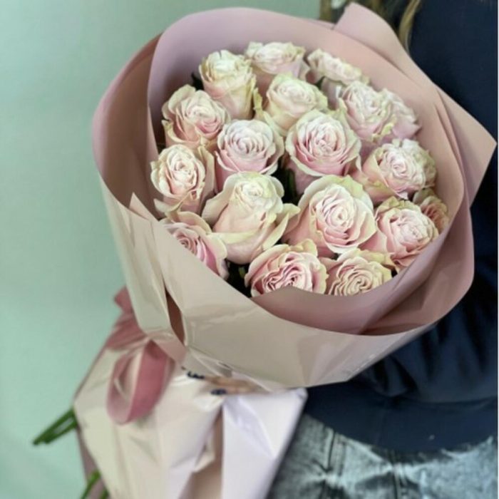 розовые розы в декоративной упаковке. – 19 шт.