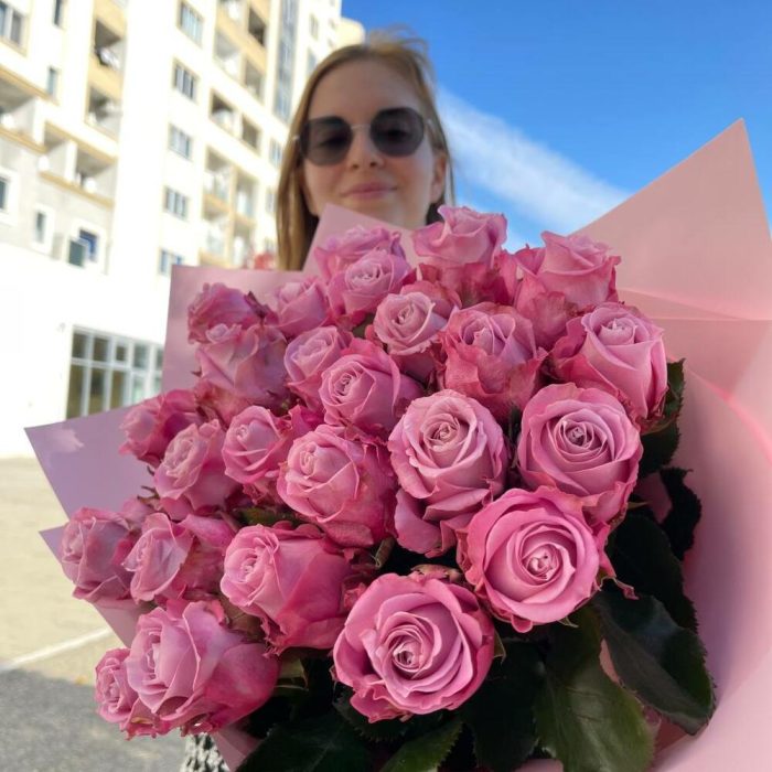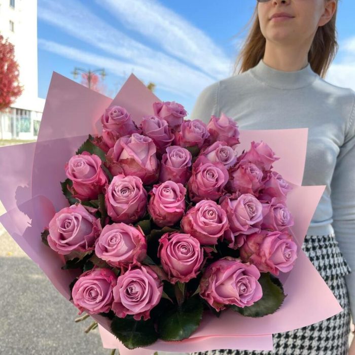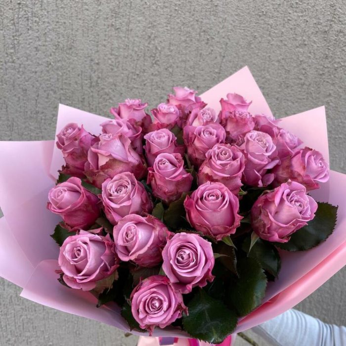 фиолетовые розы – 25 шт. Упаковка – 1 шт. Атласная лента – 1 шт.