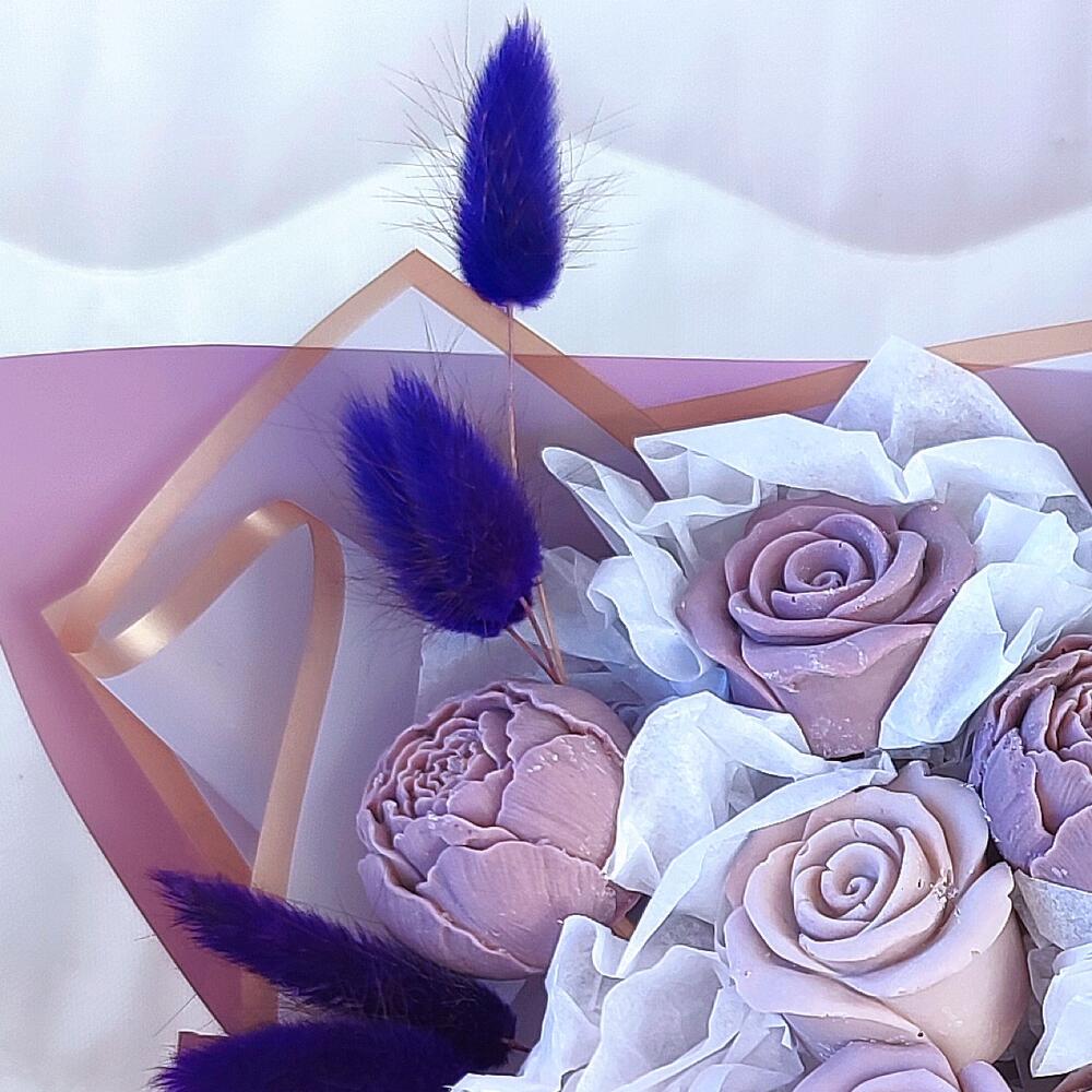 Лента атласная – 1 шт.Упаковка дизайнерская – 2 шт.Лагурус (сухоцвет) – 5 шт.белый бельгийский шоколад callebaut – 9 шт.
