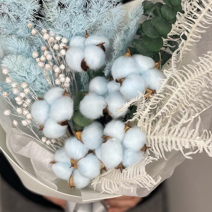 Лента – 1 шт.Упаковка дизайнерская – 1 шт.Эвкалипт стабилизированный – 3 шт.хлопок цветной – 7 шт.аспарагус стабилизированный – 1 шт.папоротник стабилизированный – 2 шт.лен сухоцвет – 11 шт.