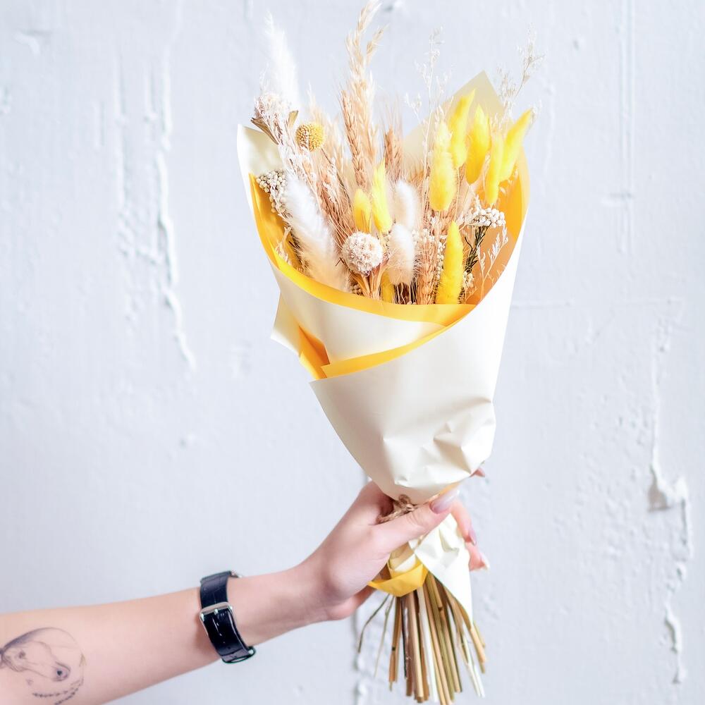 Краспедия – 1 шт.Упаковка дизайнерская – 1 шт.Лагурус – 2 шт.Скабиоза сухая – 2 шт.Тритикале – 1 шт.лимониум стабилизированный – 1 шт.озотамнус стабилизированный – 1 шт.ампелодесмос – 1 шт.кисточки пампасной травы – 2 шт.