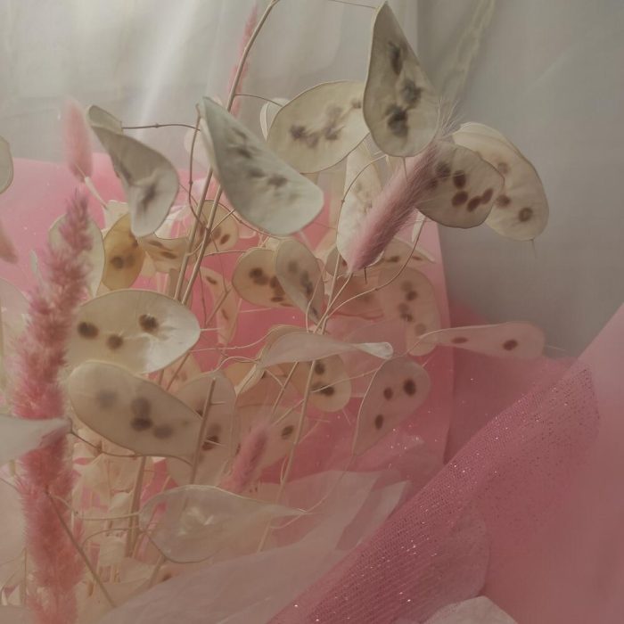 лунария стабилизированная банч – 1 шт.Лагурус (сухоцвет) – 6 шт.камыш декоративный – 2 шт.Тишью – 2 шт.сетка мерцающая – 1 шт.Упаковка дизайнерская – 2 шт.