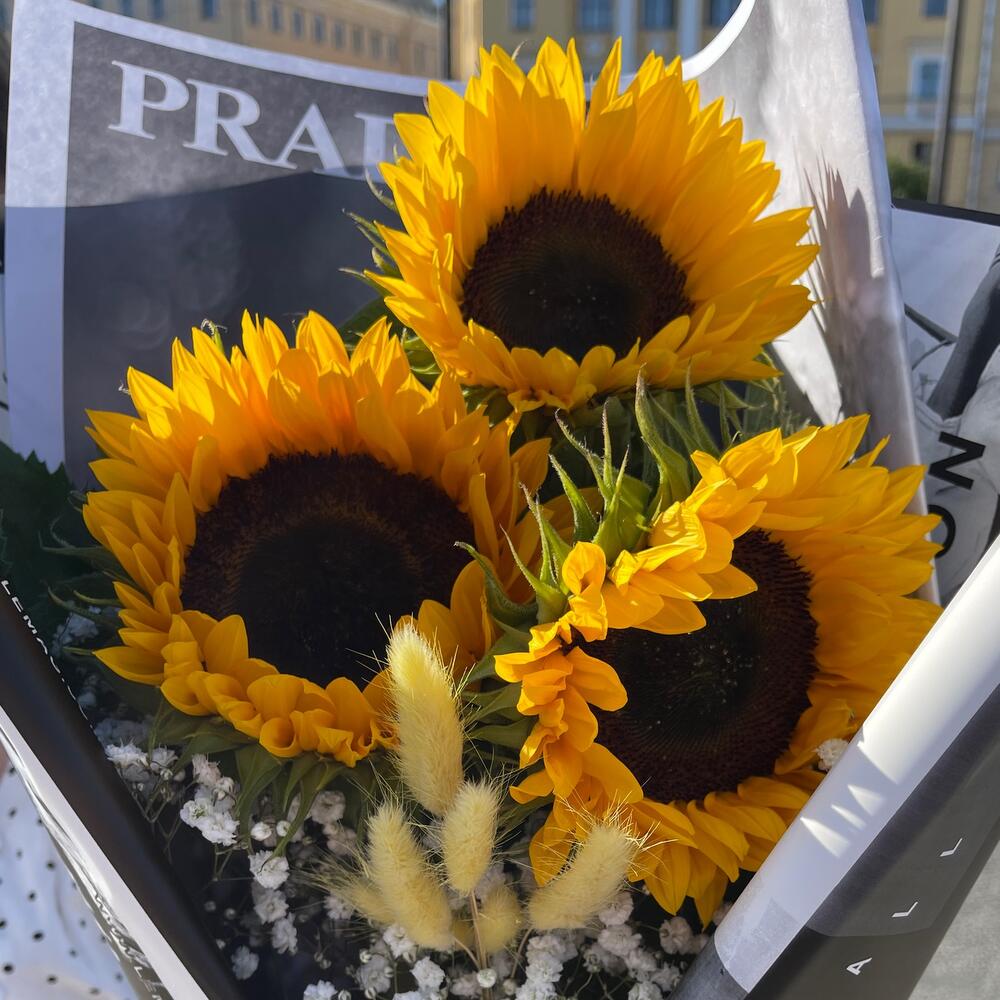 Гипсофила – 1 шт.Лента – 1 шт.Подсолнух – 3 шт.Сухоцветы – 3 шт.бумага дизайнерская – 1 шт.