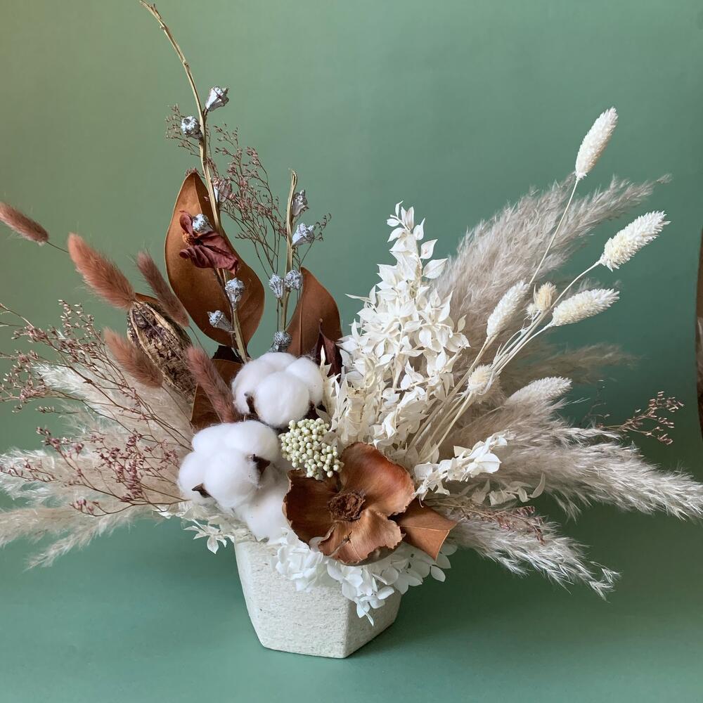 Кашпо керамическое – 1 шт.Оазис флористический – 1 шт.пампасная трава – 3 шт.Хлопок натуральный – 3 шт.цветок из коры – 1 шт.экзотический плод – 1 шт.ветки эвкалипта с плодами – 2 шт.иглица стабилизированная – 2 шт.фаларис сухоцвет – 7 шт.Лагурус (сухоцвет) – 7 шт.Лимониум – 2 шт.листья магнолии – 6 шт.Озотамнус белый – 2 шт.эрингиум мини стабилизированный – 3 шт.гортензия белая стабилизированная – 3 шт.пленка прозрачная упаковочная – 1 шт.