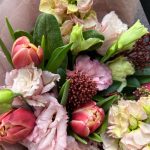 Тюльпан пионовидный – 7 шт.Маттиола – 2 шт.Скиммия – 1 шт.эустома махровая розовая – 2 шт.Тишью – 2 шт.Пленка матовая – 3 шт.Лента атласная – 2 шт.